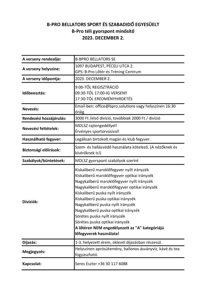 2023. December 2-án tartjuk az idei év utolsó B-Pro Gyorspont minősítő versenyét, amelyre szeretettel várunk!